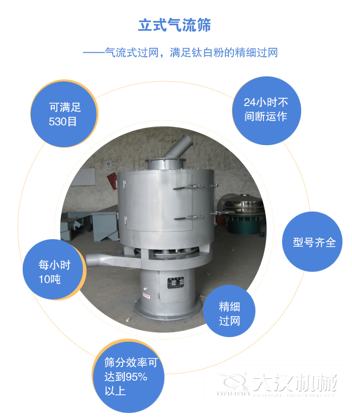 大漢機械生產(chǎn)的氣流篩分機可以滿足530目以內(nèi)的超微細粉篩分,所以對于400目鈦白粉的篩分工作可以輕松滿足。