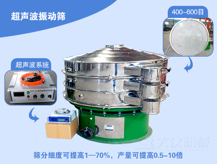 超聲波振動篩是在普通的振動篩上加裝了超聲波電源系統(tǒng),適用于400目 - 600目超細物料的篩分、除雜、過濾、分級。