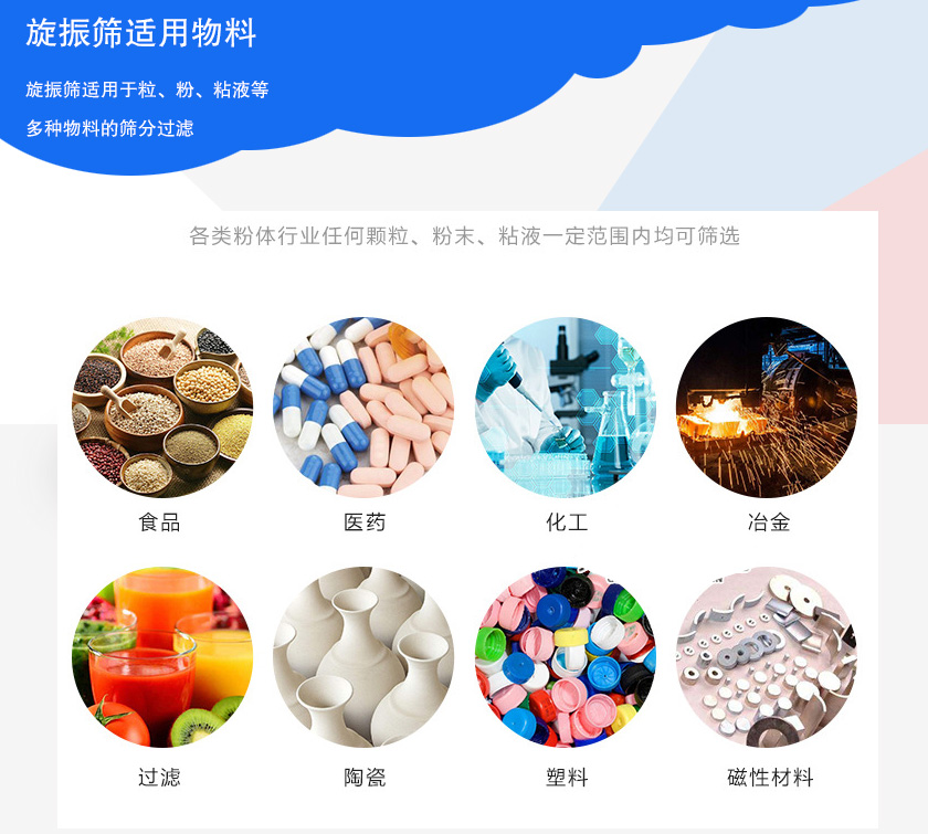 旋振篩適用于粒、粉、粘液等多種物料的篩分過濾。對于一些高精度、易團(tuán)聚的粉末物料則會出現(xiàn)粘網(wǎng)現(xiàn)象。