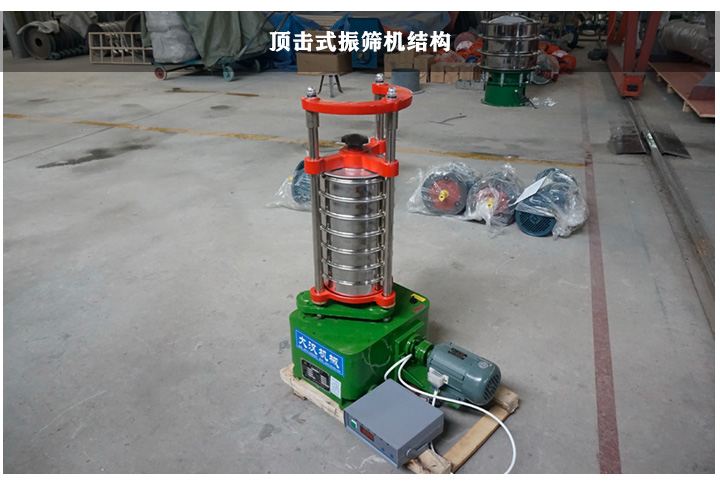 頂擊式振篩機體型小,結(jié)構(gòu)簡單緊湊。定時器、開關(guān)、振動電機位于下層,振動電機運作,定時器啟動定時篩分時間,繼而位于底座上方的振動托盤把振動力傳給篩具,篩具的周圍有螺桿,螺桿的上下兩端被圓手柄固定在頂蓋和振動托盤的邊緣處,這樣可以支撐起頂蓋和振動托盤,篩具位于兩者之間,由頂蓋按壓,托派也可以上下移動位置,這樣物料在振動時篩分時振動力會更加明顯,提高篩分效果。