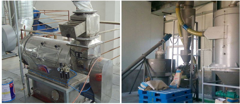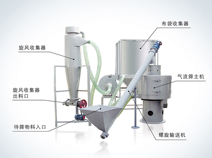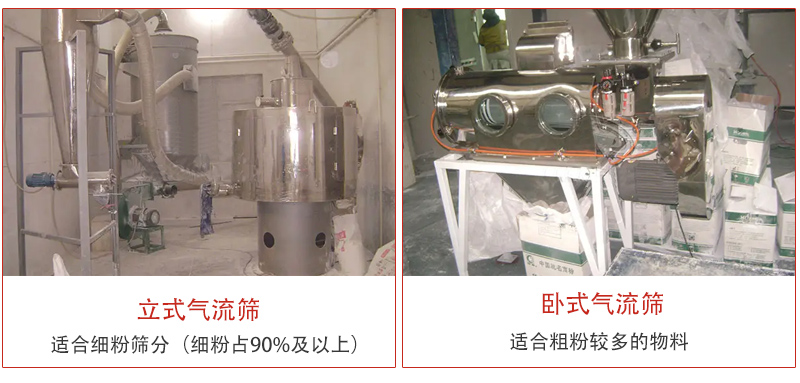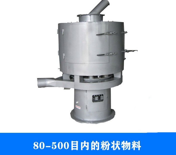 立式氣流篩分機外觀為立式,風輪葉片密集、風速高,向外噴射量大,產(chǎn)量比臥式氣流篩大,一般是礦產(chǎn)行業(yè)篩分粉料(重鈣粉等),要求被篩原料中細料90%以上,適用于細粉篩分,如面粉、石墨粉、橡膠粉、氧化鎂、珍珠巖粉、鐵粉、環(huán)氧樹脂粉等。但是立式氣流篩分機排料不方便,需要旋風除塵器和布袋除塵器組合使用。